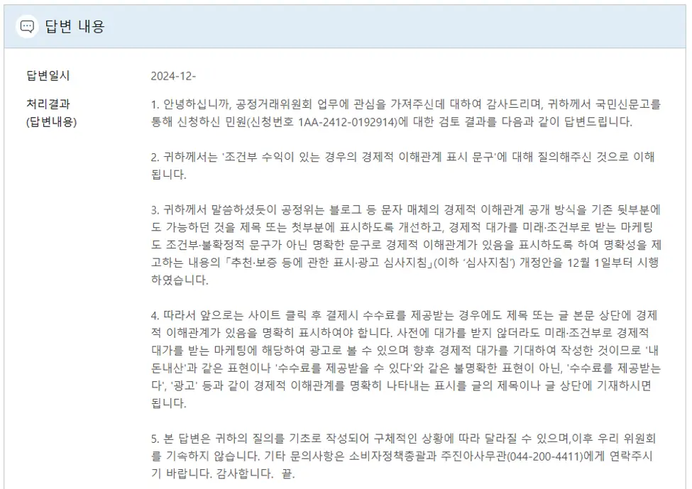 공정거래위원회, 국민신문고를 통한 공식 답변