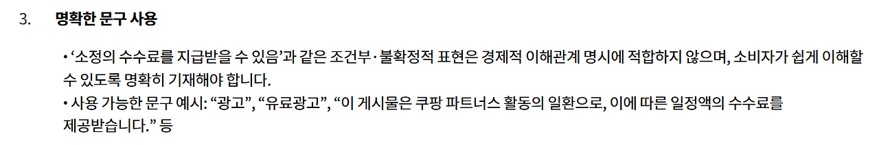 담당 사무관님 답변은 쿠팡파트너스에도 ‘구매할 때마다 일정 비율의 수수료를 지급받습니다’라고 기재해도 문제되지 않지만, 쿠팡에서 제공하는 그냥 수수료를 제공받는다고 쓰면 더 좋을 것 같다고 말씀하시네요.