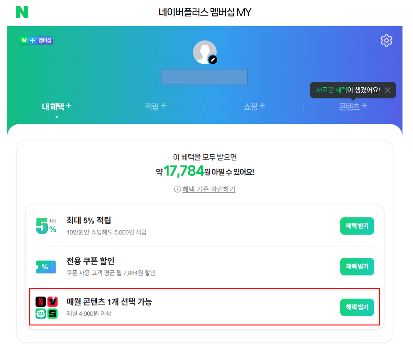 멤버십 페이지에 들어가면, 쿠폰과 콘텐츠 혜택을 선택해서 받을 수 있습니다.