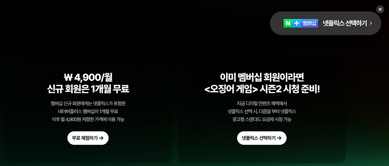 상단에 뜨는 넷프릭스 선택하기 누르시면 쉽게 신청할 수 있습니다.