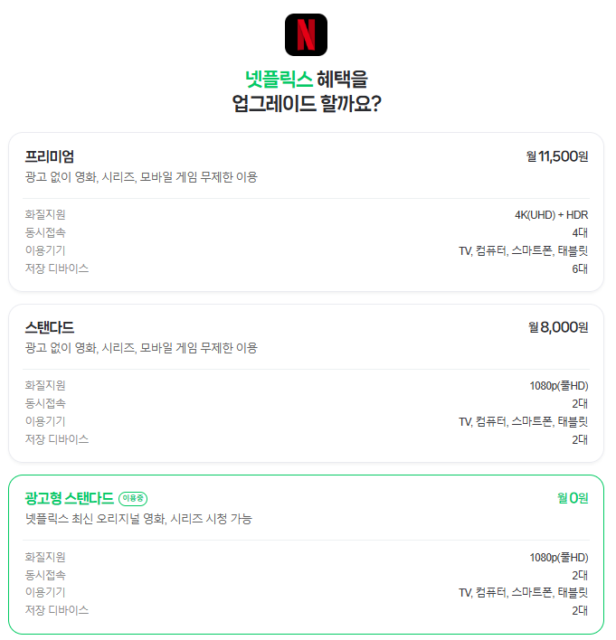 광고를 보고 싶지 않거나 더 많은 기기에서 동시 접속을 원하는 부분은 차액을 공제한 금액으로 상위 등급의 멤버십도 이용할 수 있습니다. 저는 동생과 같이 이용하고 있어서 스탠다드 무료 옵션을 잘 쓰고 있습니다 ㅎㅎ