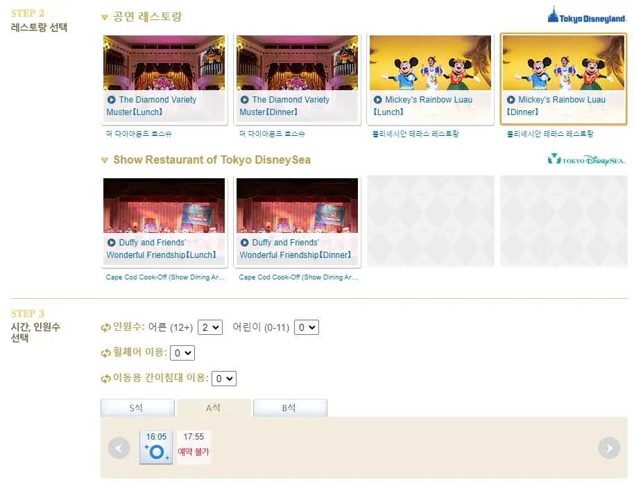 도쿄 디즈니랜드 공연 레스토랑 S석 예약 실패 후기: 더다이아몬드, 레인보우 루아우