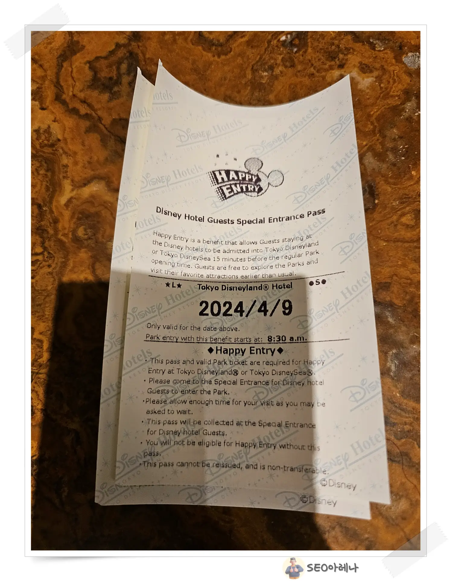 공식 디즈니랜드 호텔에 숙박하면 다음날 일찍 입장 가능한 해피엔트리 티켓을 받을 수 있습니다.