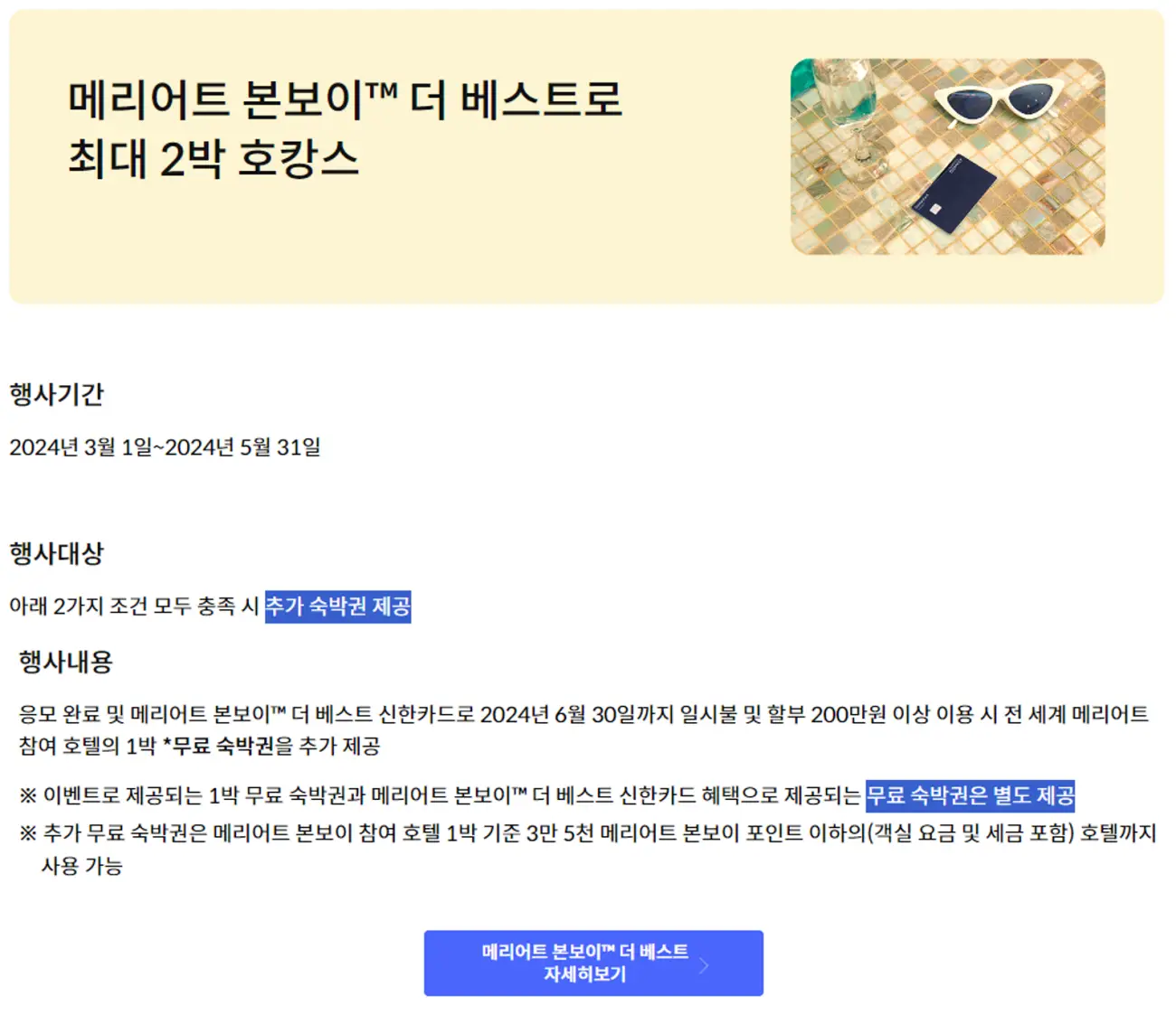 3월부터 5월 말까지 3달간 메리어트 본보이 카드를 사용한 적 없는 분이 이벤트에 참여하면 1박을 더 주는 이벤트.