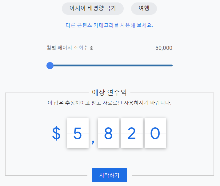 아시아 지역에서 여행 관련 주제를 다루면, 하루에 방문자가 1000명 정도 나올 때 하루 수익이 대충 $10 정도, 한달에 30만원 정도 수익을 낼 수 있다는 거예요.