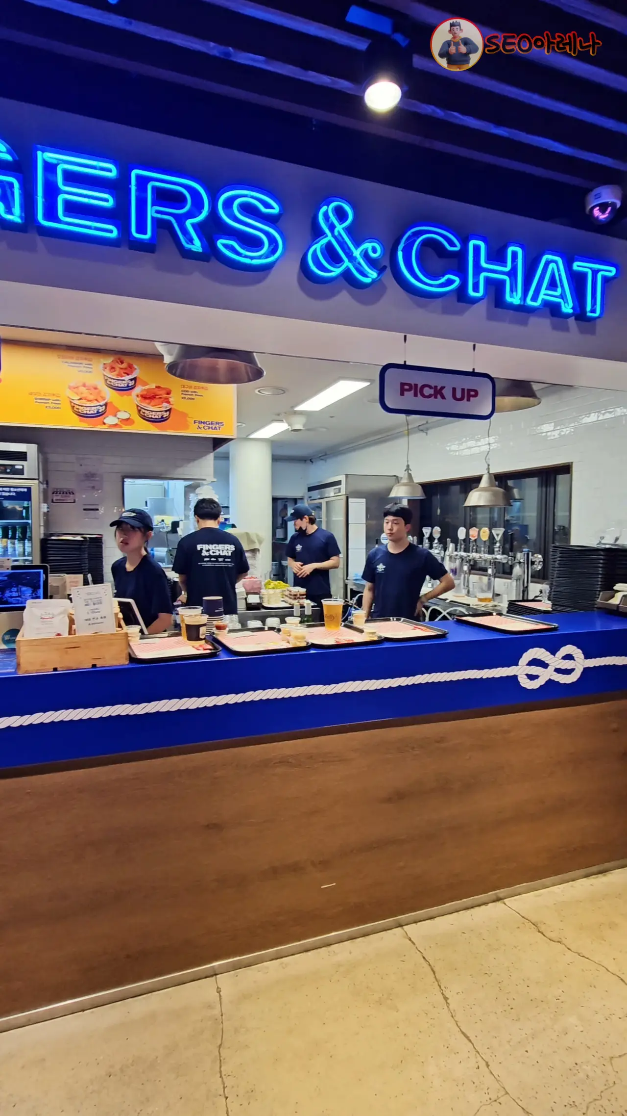 치맥이 정말 잘 어울리는 장소인데, 치킨은 팔지 않고 피시앤칩스를 1층에서 팔고 있어요. 생선튀김에 감자튀김으로 생각하시면 되는데, 치킨이 없어서 아쉬워하는 분들도 꽤 있을 것 같네요.