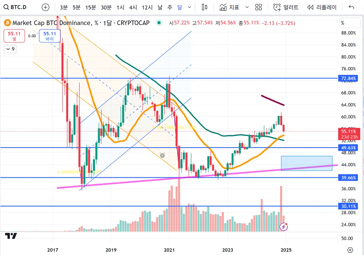 개인적으로 조합해서 만들어낸 지표보다, 비트코인 도미넌스 차트를 중요하게 보는 편이다.