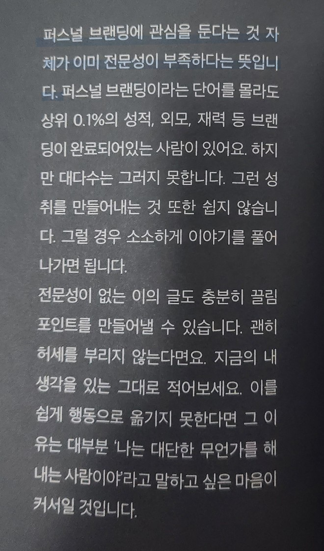 어떻게 보면 조금 냉소적이라고도 볼 수 있고요. 개인적으로 저도 ‘누구나 퍼스널브랜딩을 해야 합니다’라는 말에 회의적인 입장이어서 공감하는 내용이 많았어요.