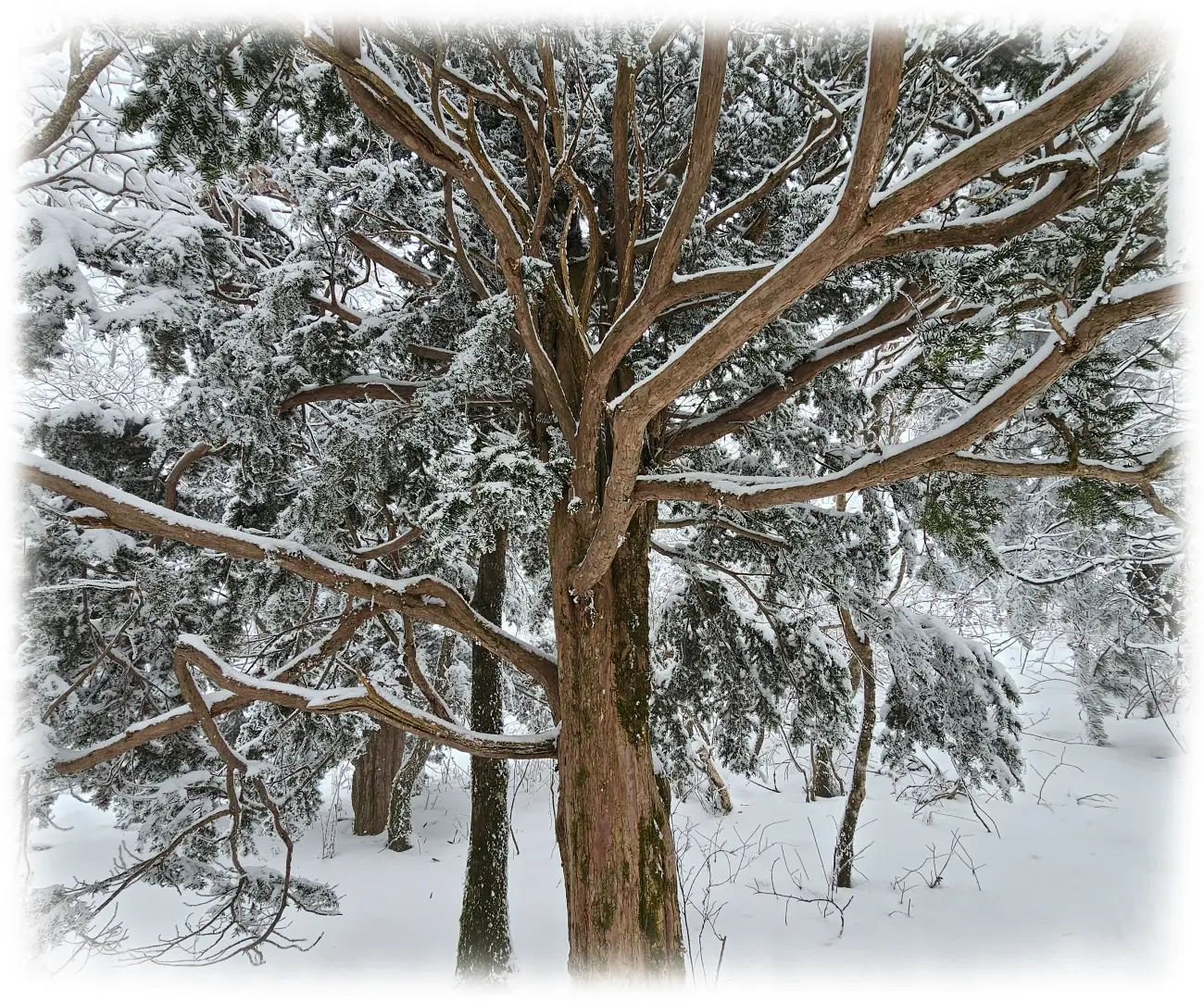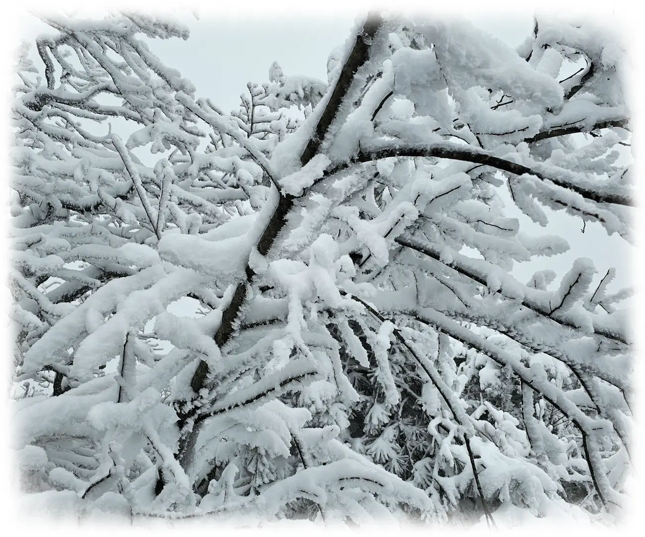 나무에 눈이 쌓인 건 종종 봤지만, 나뭇가지에 붙은 눈이 얼어붙은 건 처음봐서요.