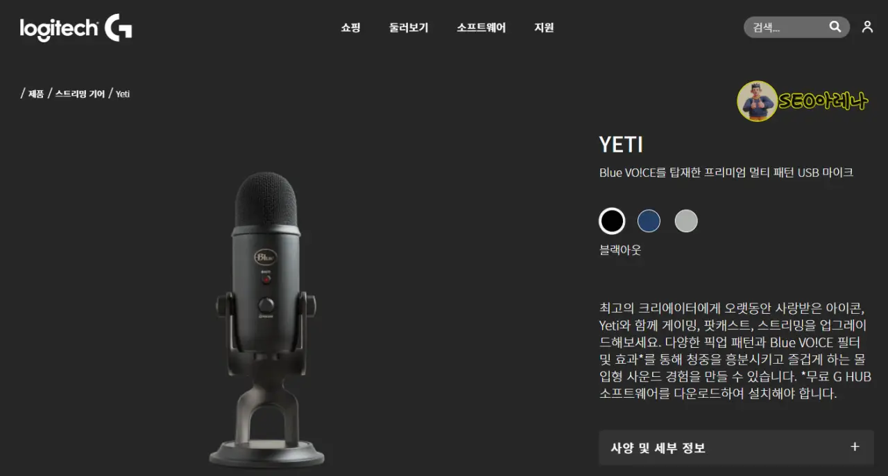 그다음으로 찾은 게 지금 구매해서 사용하고 있는 로지텍의 블루예티 X입니다.