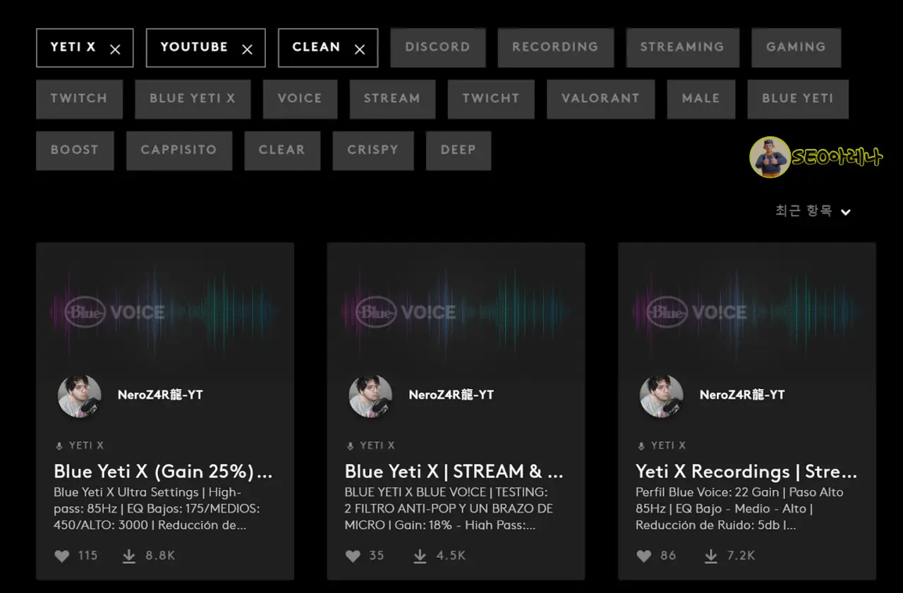 내가 원하는 설정을 저장하는 프리셋을 만들 수 있을 뿐만 아니라, 전 세계 로지텍 마이크 유저가 사용하고 있는 프리셋 설정값을 공유할 수 있습니다.