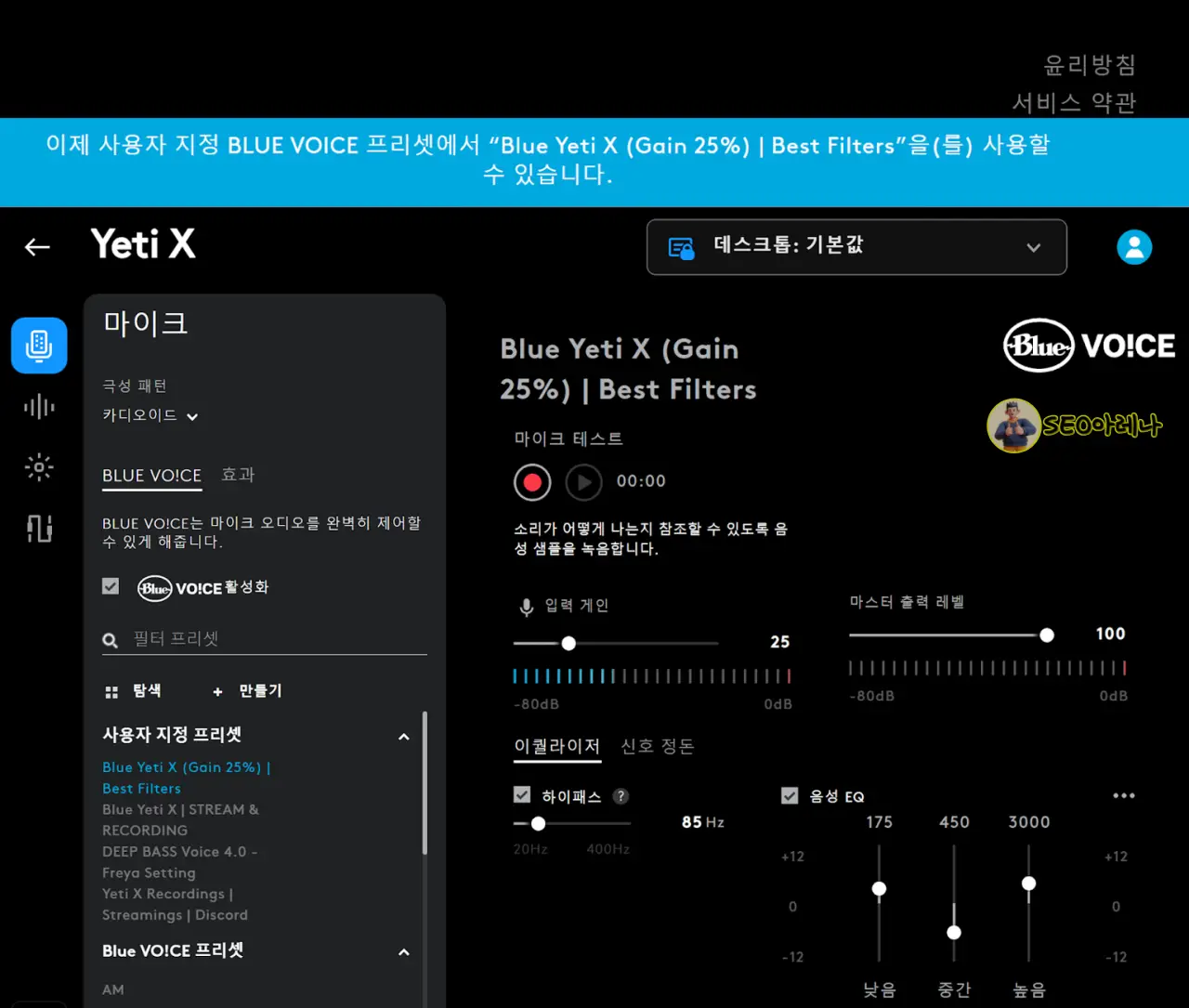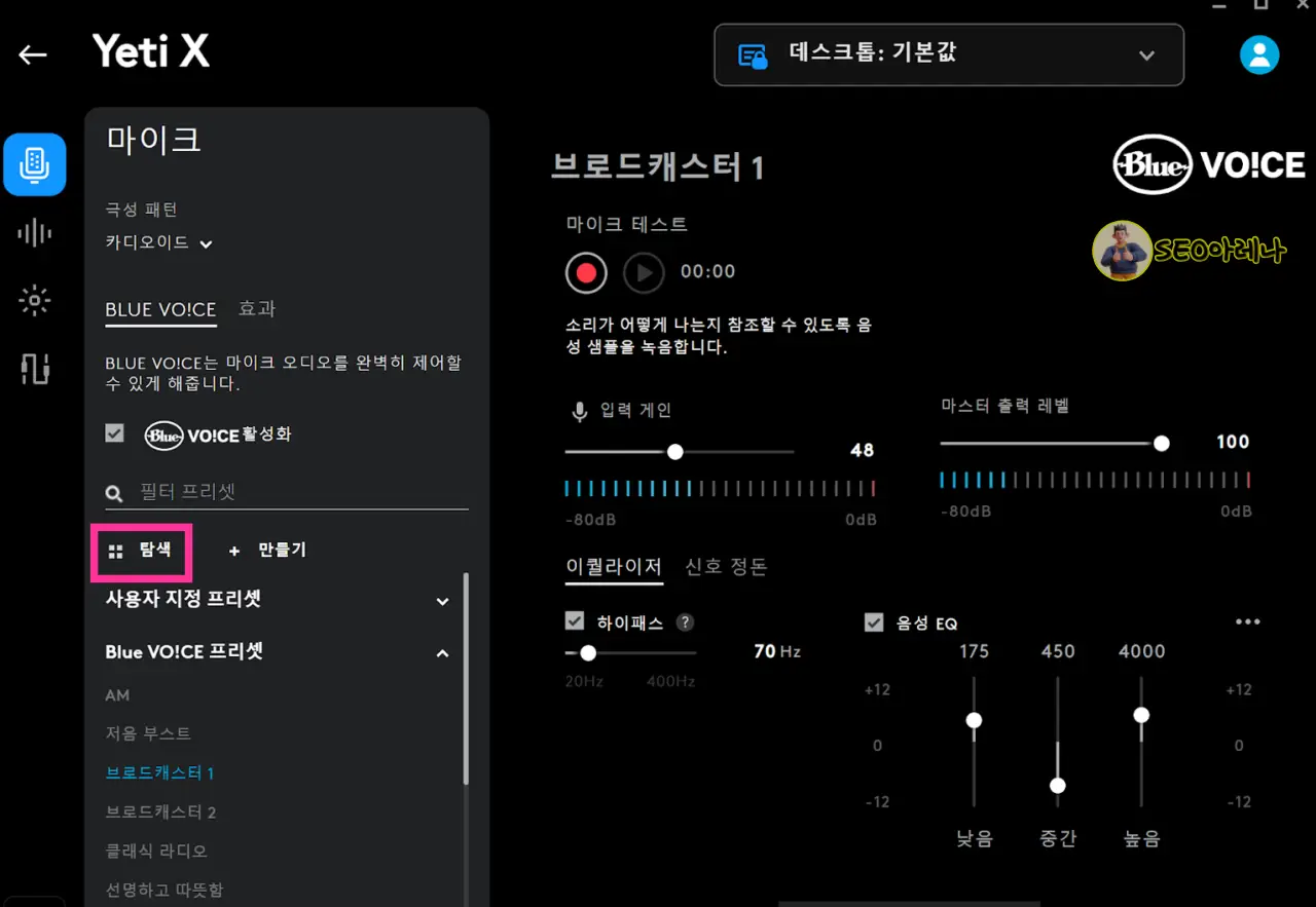 블루예티 마이크와 연동되는 로지텍의 전용 앱을 설치하면 이렇게 세부 설정을 할 수 있는데요,