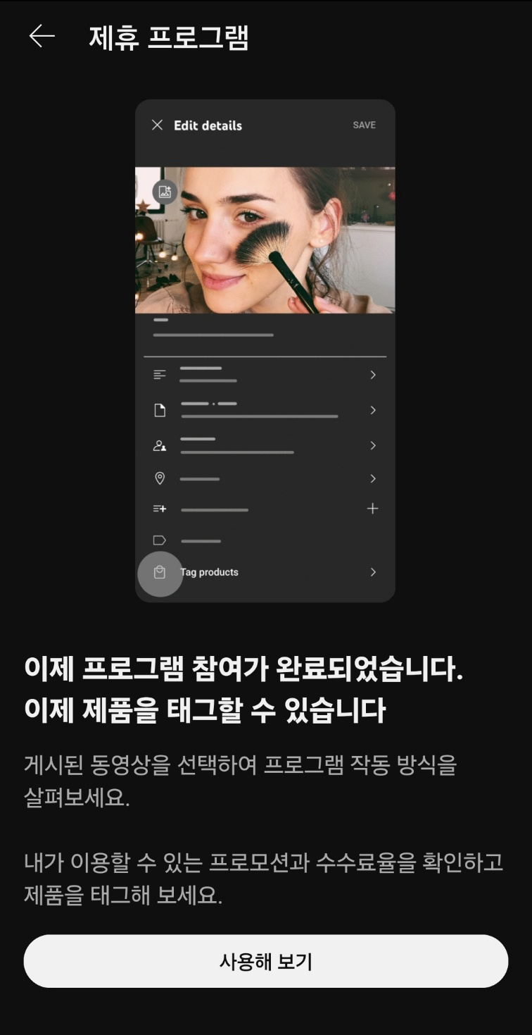 수익창출 탭에 들어가서 제휴프로그램 가입 누르고, 약관에 동의하면 제품태그를 할 수 있다.