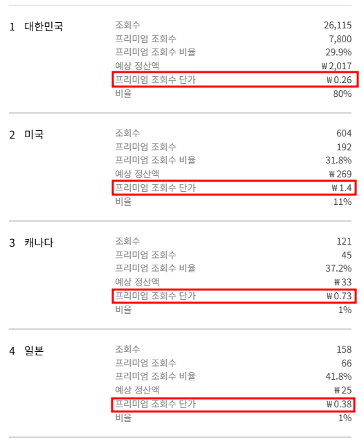 조회수 당 수익은 여전히 미국, 캐나다쪽이 2~3배 이상 높다.