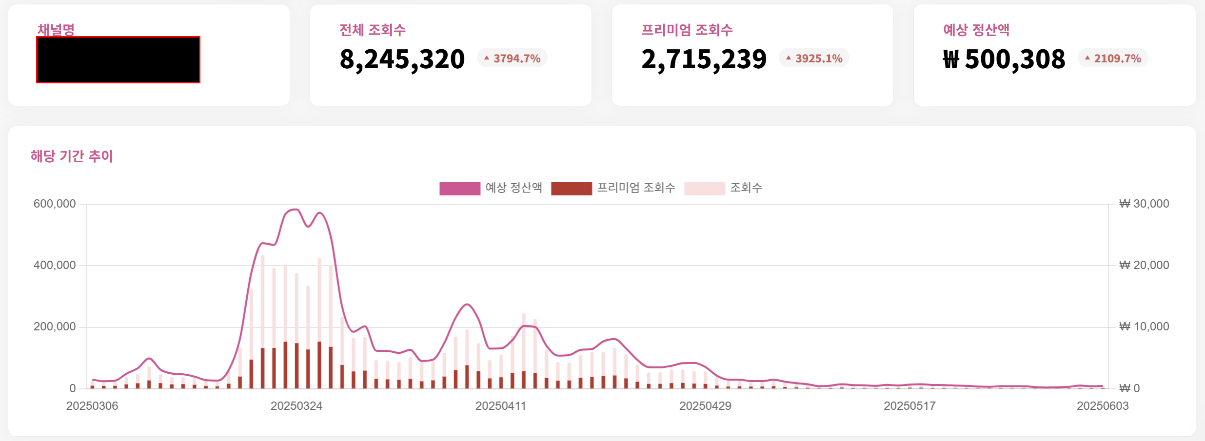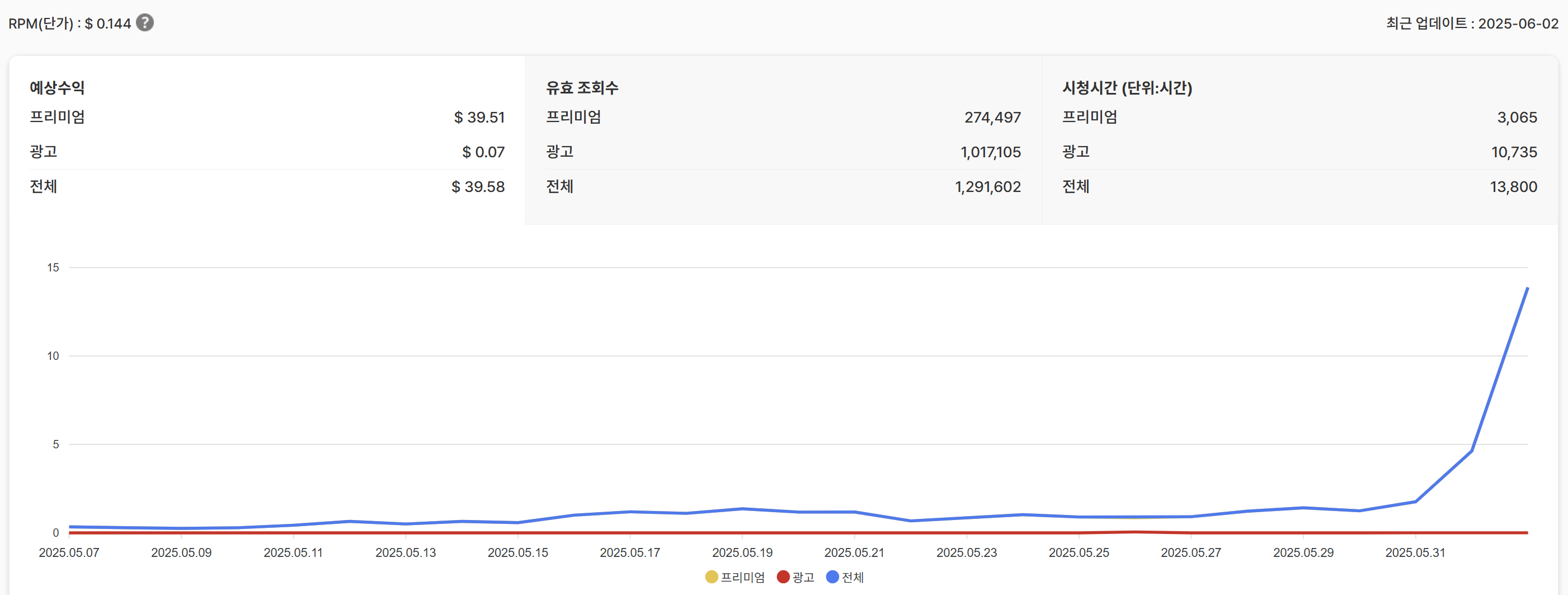 애드센스 수익이 추가되면 100~150 정도 추가될 수 있겠으나 역시 높은 조회수로 수익을 내는 방식은 한계가 있다.