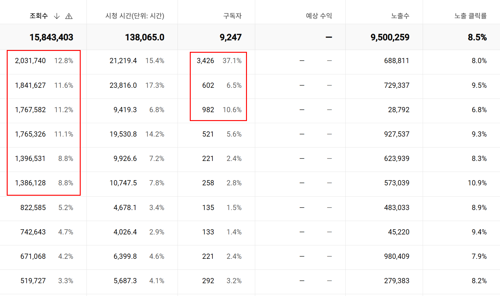 블로그도 그러하듯, 모든 콘텐츠가 균등하게 조회수가 잘 나오기는 어렵다. 일부 소수의 콘텐츠가 폭발적인 반응을 얻는 경우가 많은데, 그렇다고 조회수가 나오지 않는 영상이 필요없다는 의미는 아니다.
