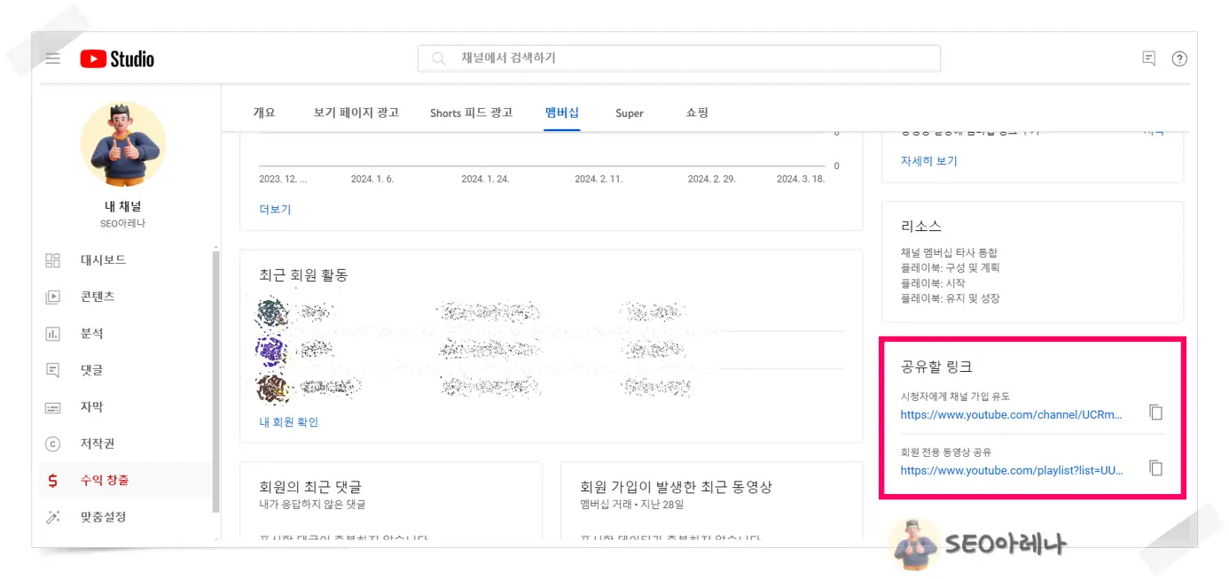 유튜브 스튜디오, 멤버십 가입 유도 링크 확인하는 방법