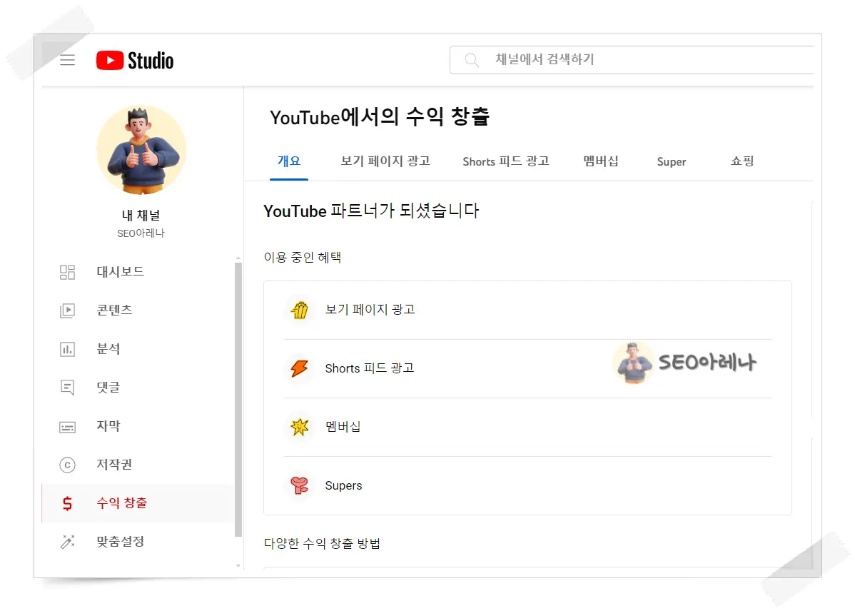 1. 유튜브 스튜디오 메인 화면 - 수익창출