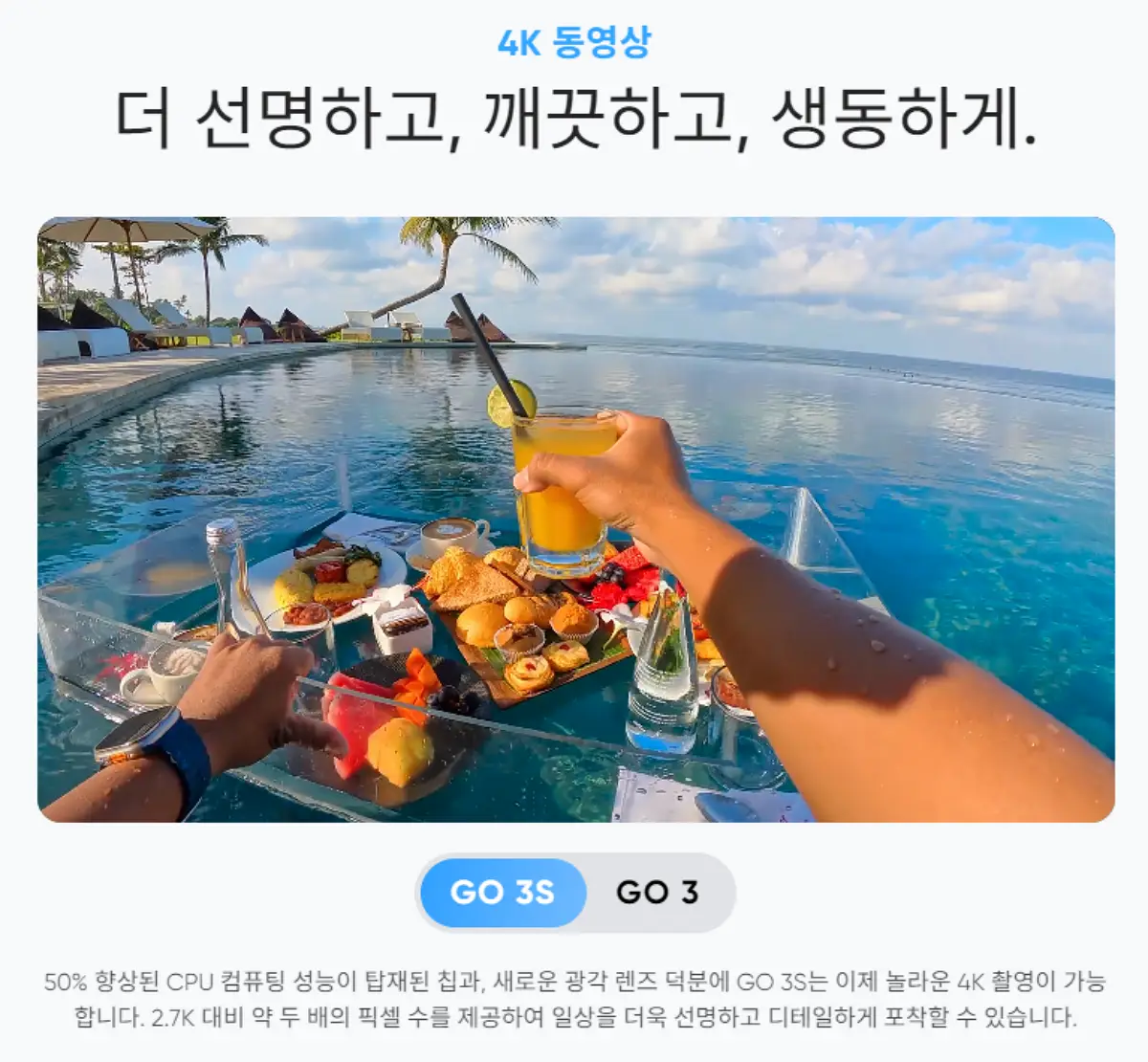 유튜브 리뷰를 보면 굳이 4K 촬영이 필요없으신 분들은 Go3 구형을 그대로 쓰는 걸 추천하시는 분들도 종종 있더라고요.