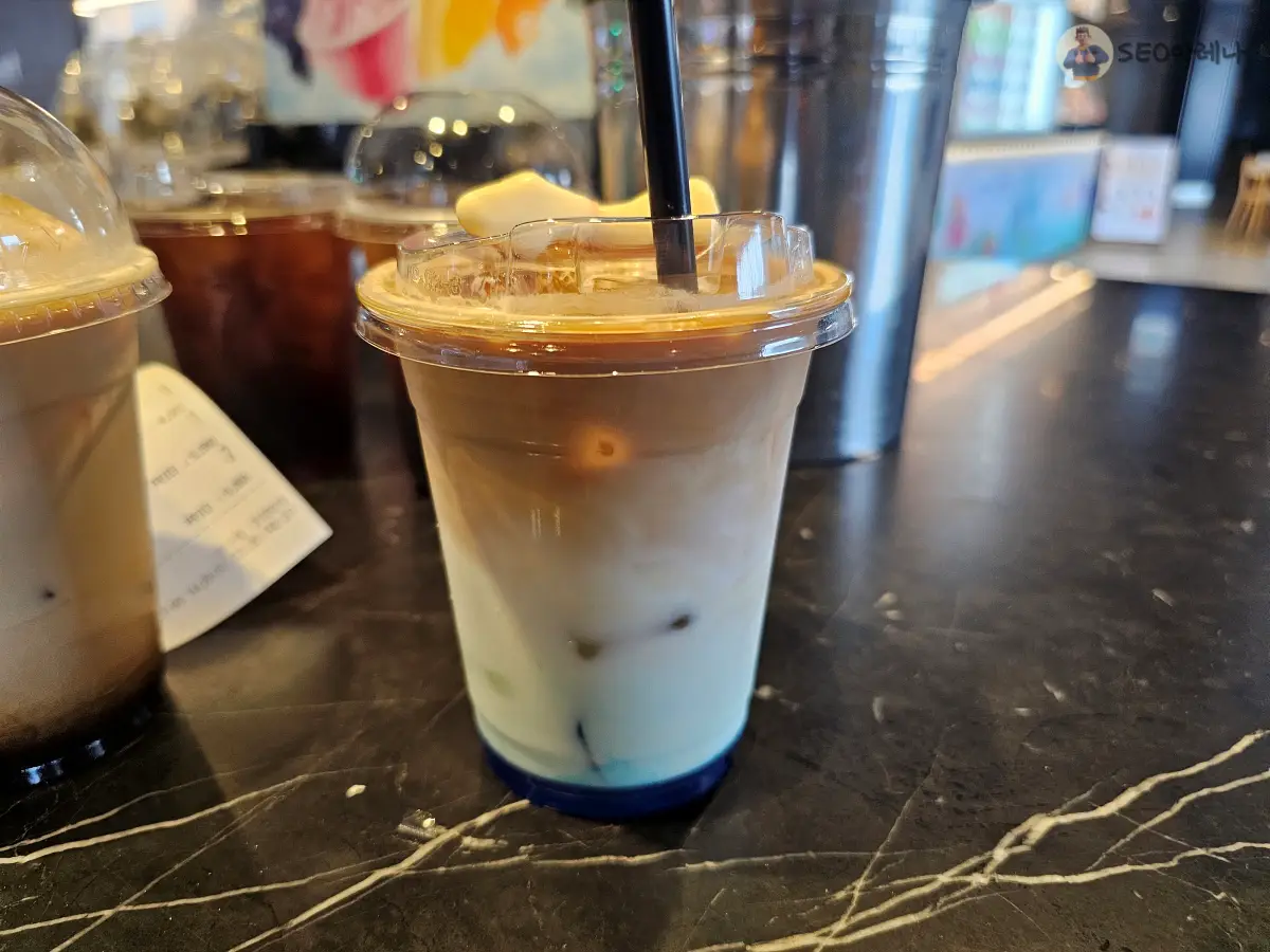 아쿠아라떼는 파랑색 시럽을 아래에 넣고 카페라떼와 같은데, 개인적으로는 아주- 별로였습니다.