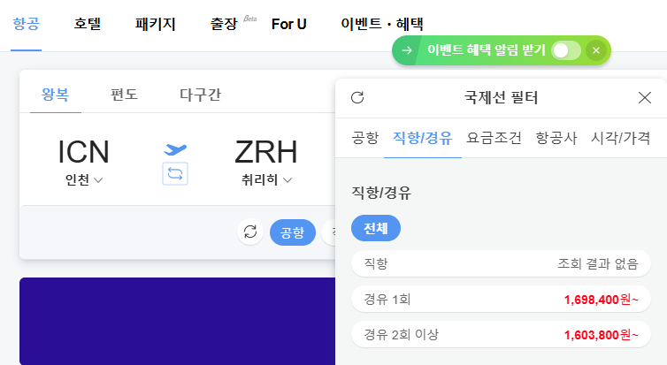 가격비교사이트에서는 딱 이코노미석만 기준으로 조회를 하기 때문에 이 옵션이 구글, 네이버 항공권에서는 볼 수가 없었어요.