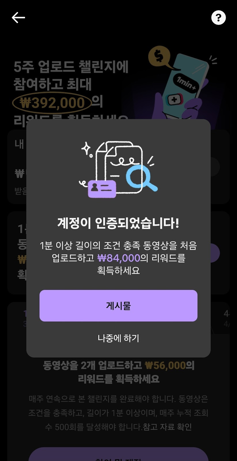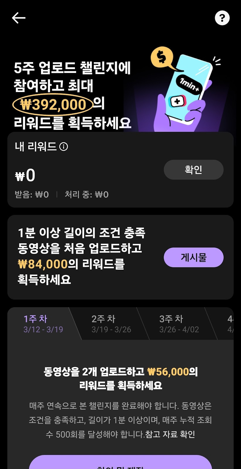 1분 이상 길이의 영상을 업로드하기만 해도 84,000원을 준다니. 누가 보면 진짜 사기아니냐는 생각이 들 만하다.