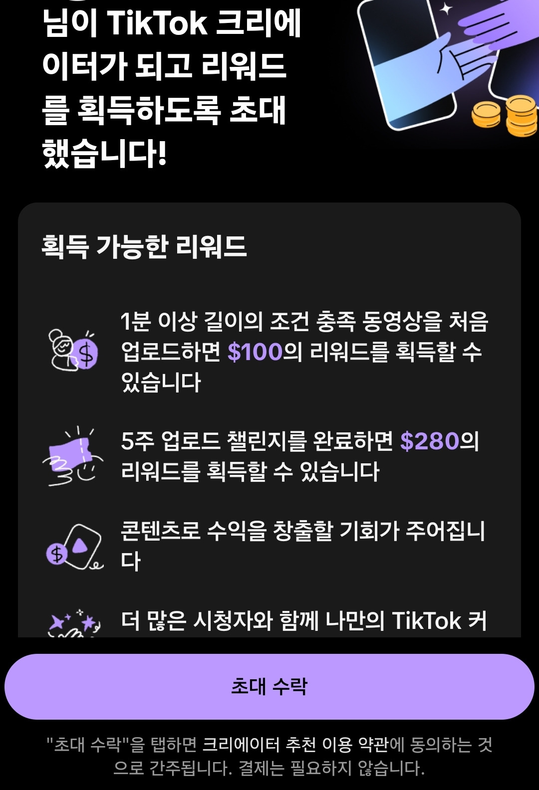단순히 조회수 수익(리워드)을 주는 것 뿐만 아니라, 1분 이상 길이의 영상을 올리면 $100, 5주 동안 $280을 준다고 해서 처음엔 스팸인 줄 알았다.