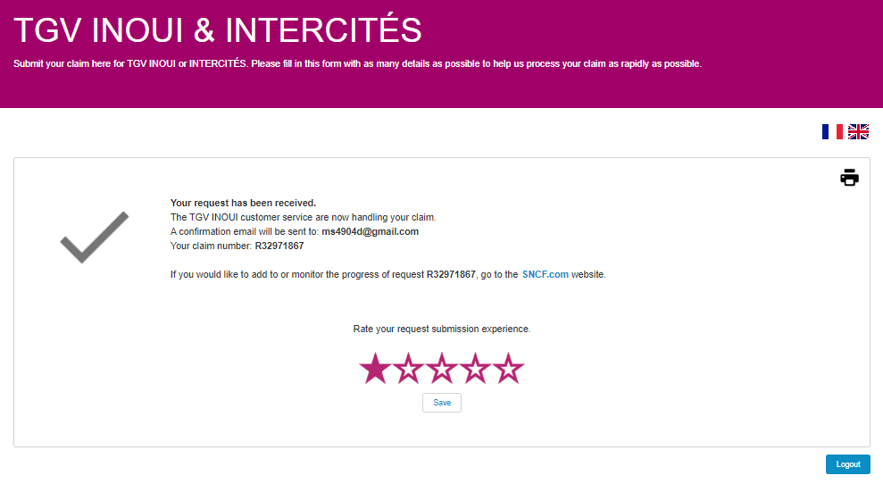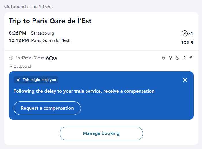 SNCF 공식 홈페이지에서 티켓을 구매했다면 이렇게 ‘보상(compensation)’을 요청하라거나 기차가 취소되었으니(Train cancelled) 환불 절차에 대해 안내하는 문구가 나옵니다.
