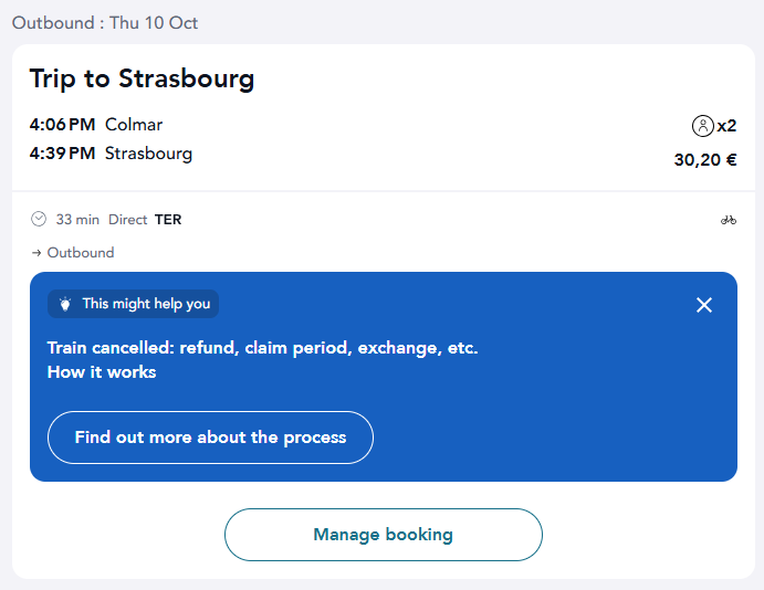 SNCF 공식 홈페이지에서 티켓을 구매했다면 이렇게 ‘보상(compensation)’을 요청하라거나 기차가 취소되었으니(Train cancelled) 환불 절차에 대해 안내하는 문구가 나옵니다.