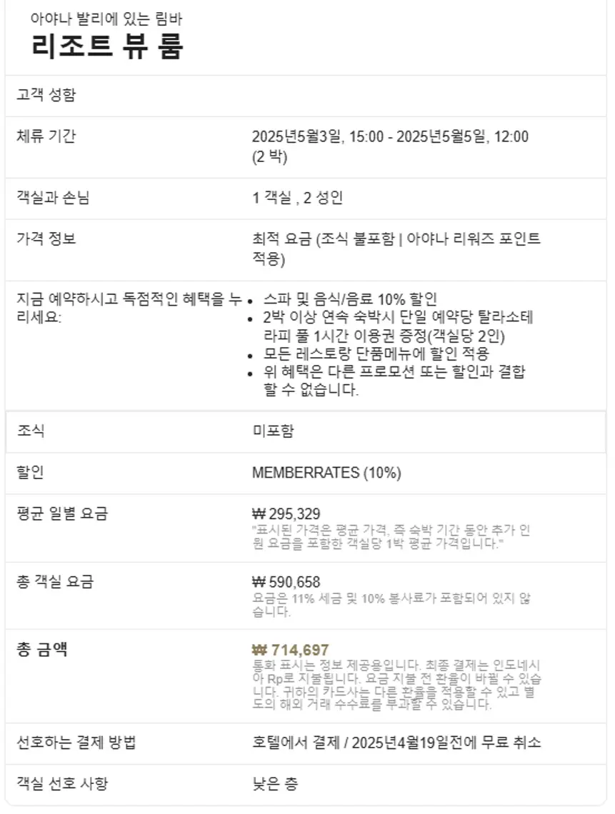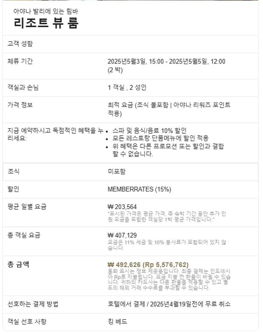 제가 작년 11월에 예약한 발리 호텔 내역입니다.