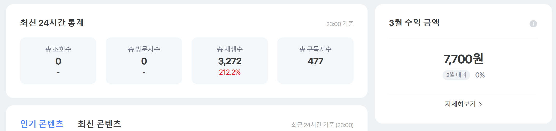 인스타는 조회수는 잘 나오는데, 아직 수익이 0이라서 아쉽긴 하다. 빨리 음원 저작권 수익이라도 받았으면.