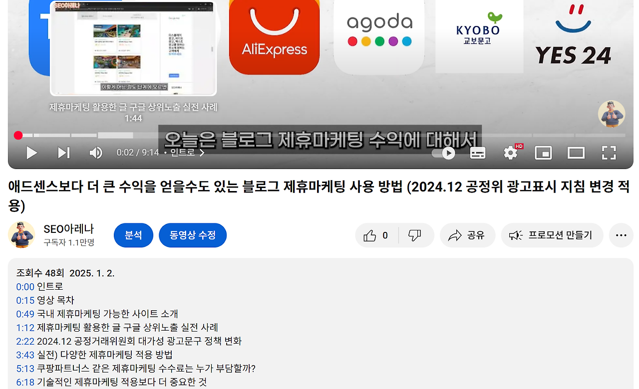 유튜브 영상 세부정보에 있는 설명탭에 0:00을 추가해주었습니다.